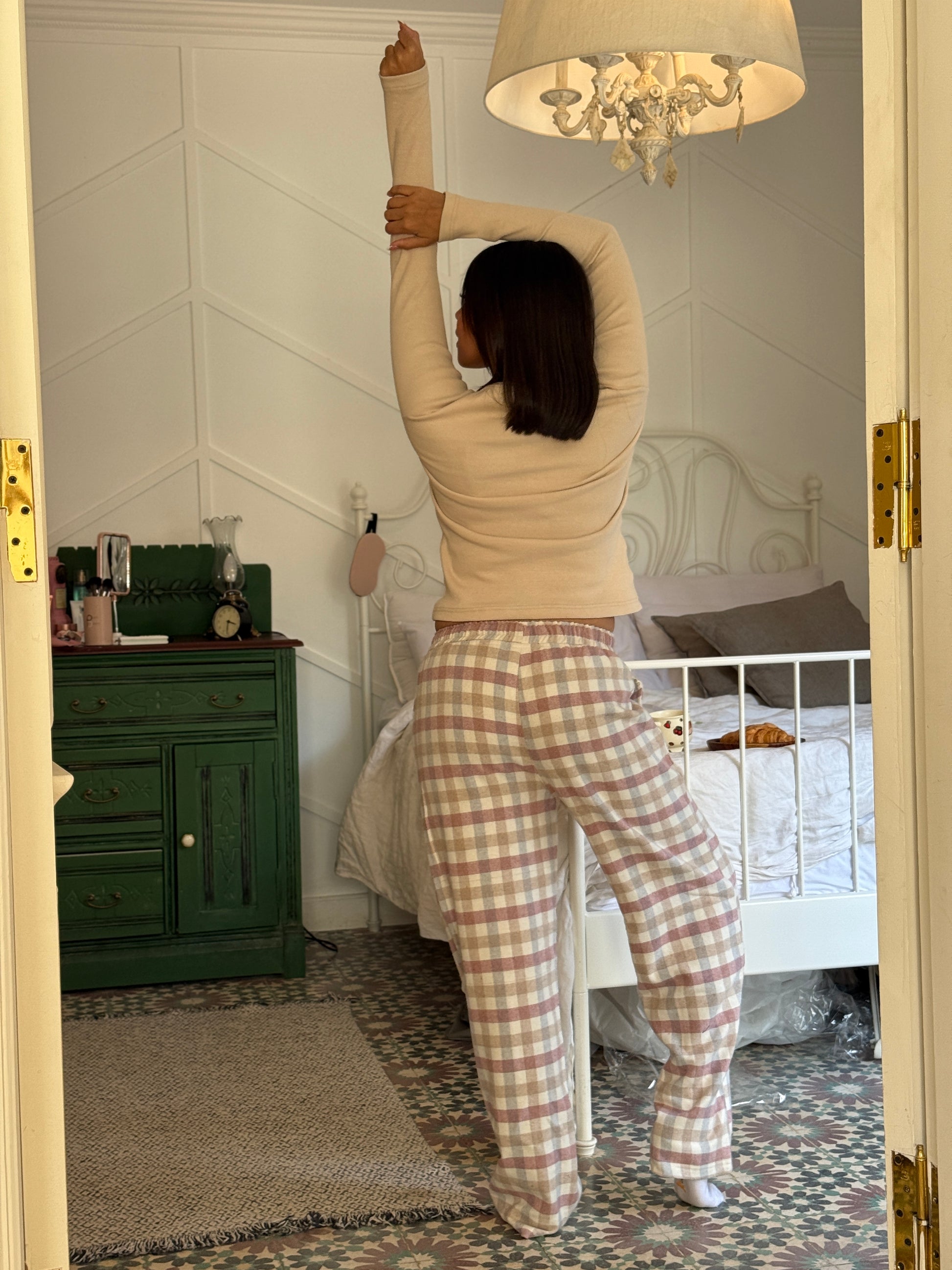 The wide-leg pants feature a soft wool-blend fabric (50% cotton, 50% polyester) with timeless beige, brown, and blush checks — giving a cozy yet elegant winter vibe.