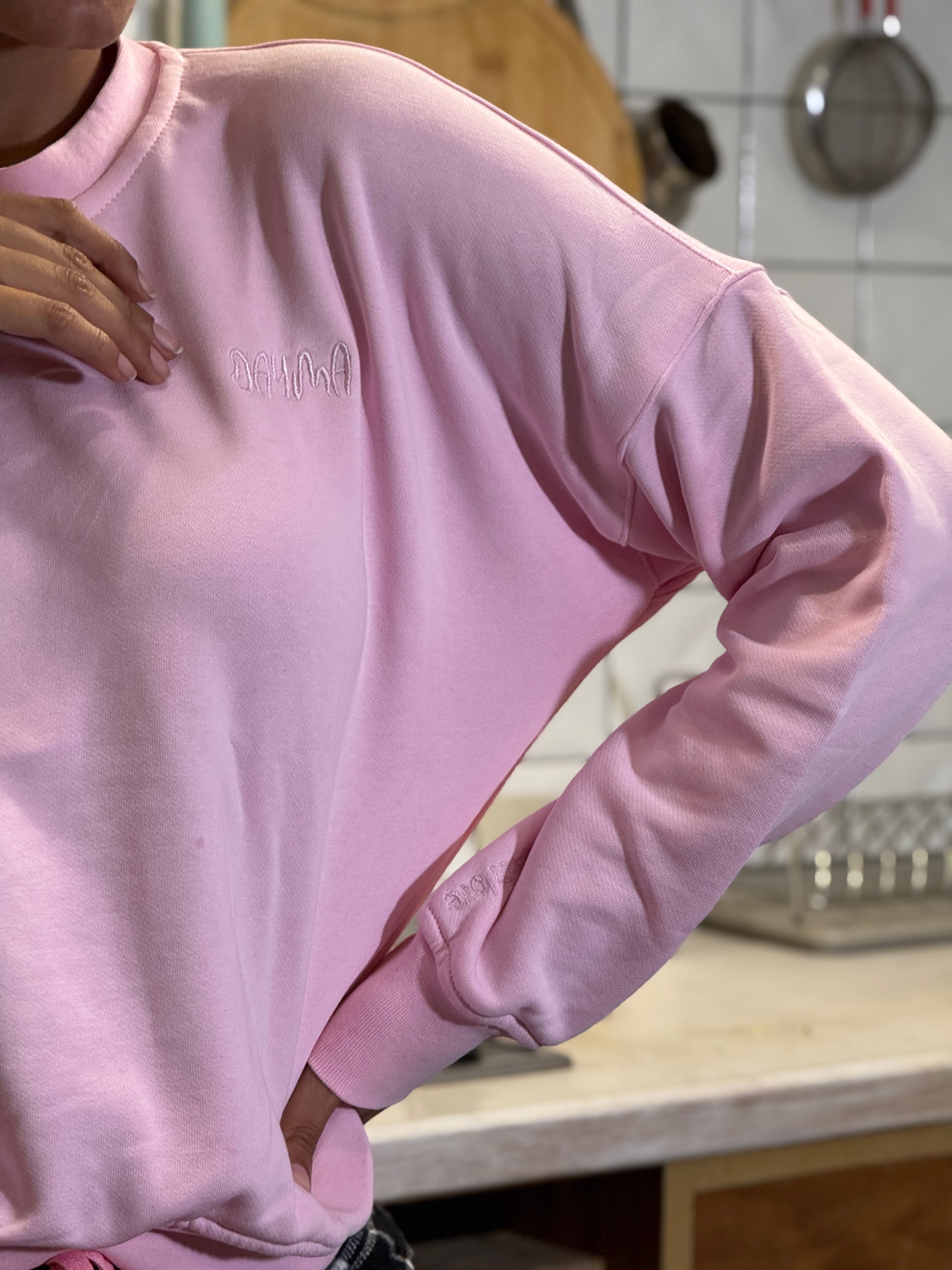 Paired with a blush pink regular-fit embroidered sweatshirt made from 100% cotton, adding a gentle pop of color and a touch of playful elegance.